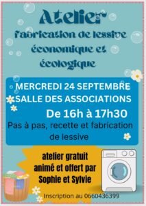 Ce mercredi 24 septembre, salle des associations, un atelier vous est proposé pour apprendre à fabriquer sa lessive économique et écologique.